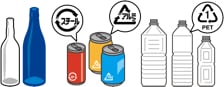 飲料・食品用の缶、飲料・食品びん、飲料用・しょうゆ用等のペットボトルなど |