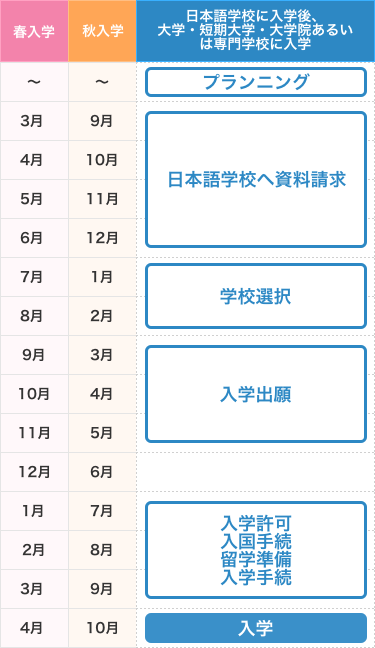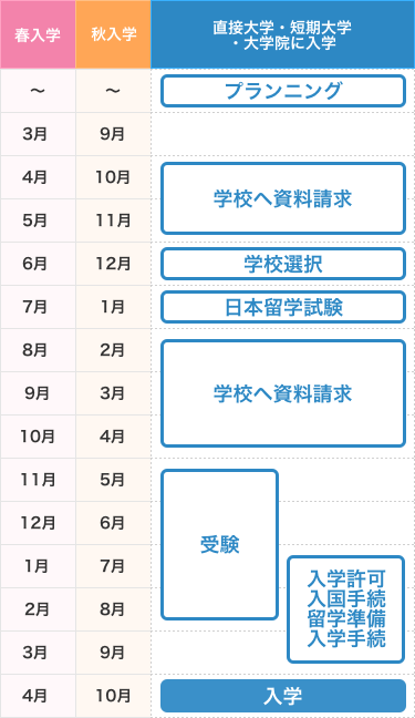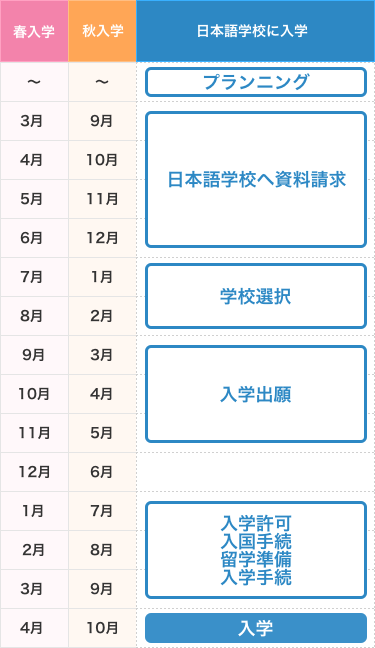 京都(日本)での留学の一般的な入学までの流れです。入学まで1年以上の準備期間が必要ですので、下記を参考にしっかりと準備していきましょう。