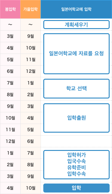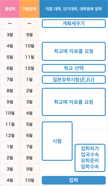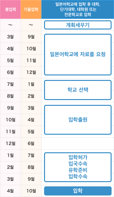 교토(일본)유학에 있어서 일반적인 입학 과정 입니다.입학까지는 1년 이상의 준비기간이 필요합니다. 아래 자료를 참고하여 준비하시길 바랍니다.